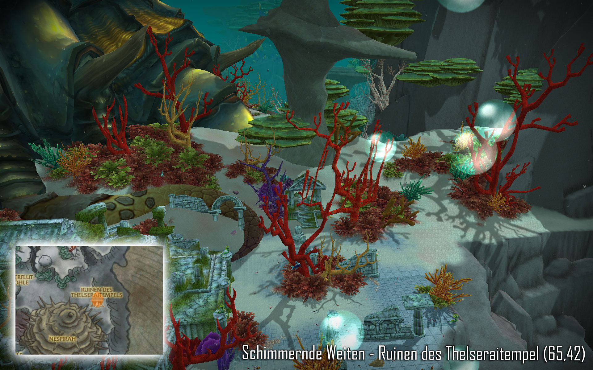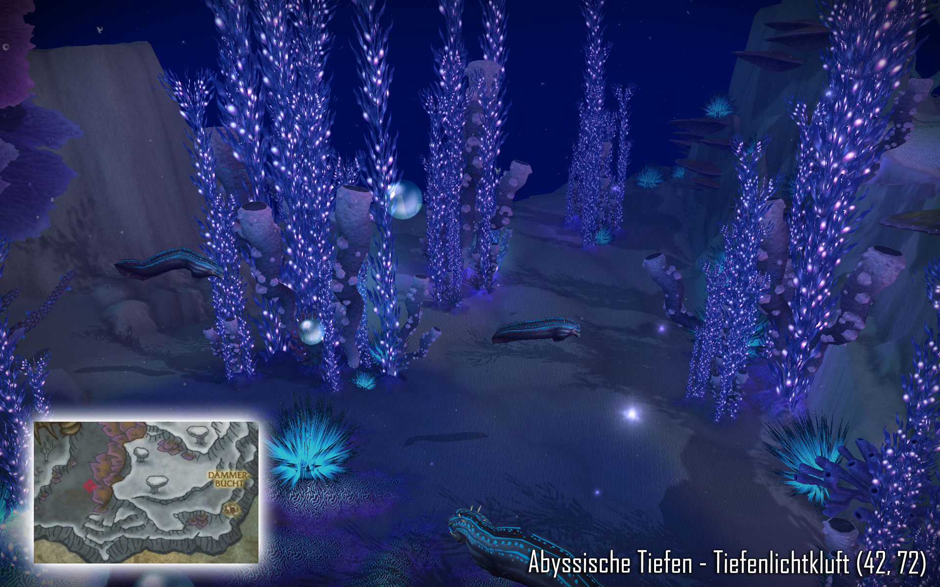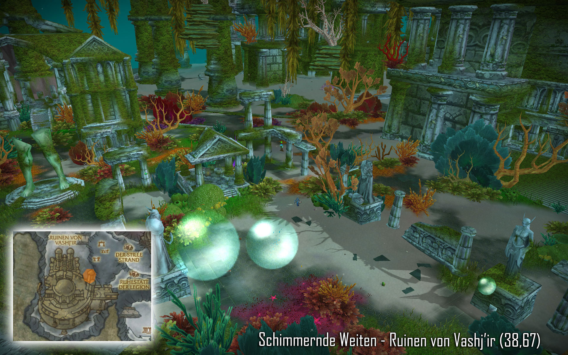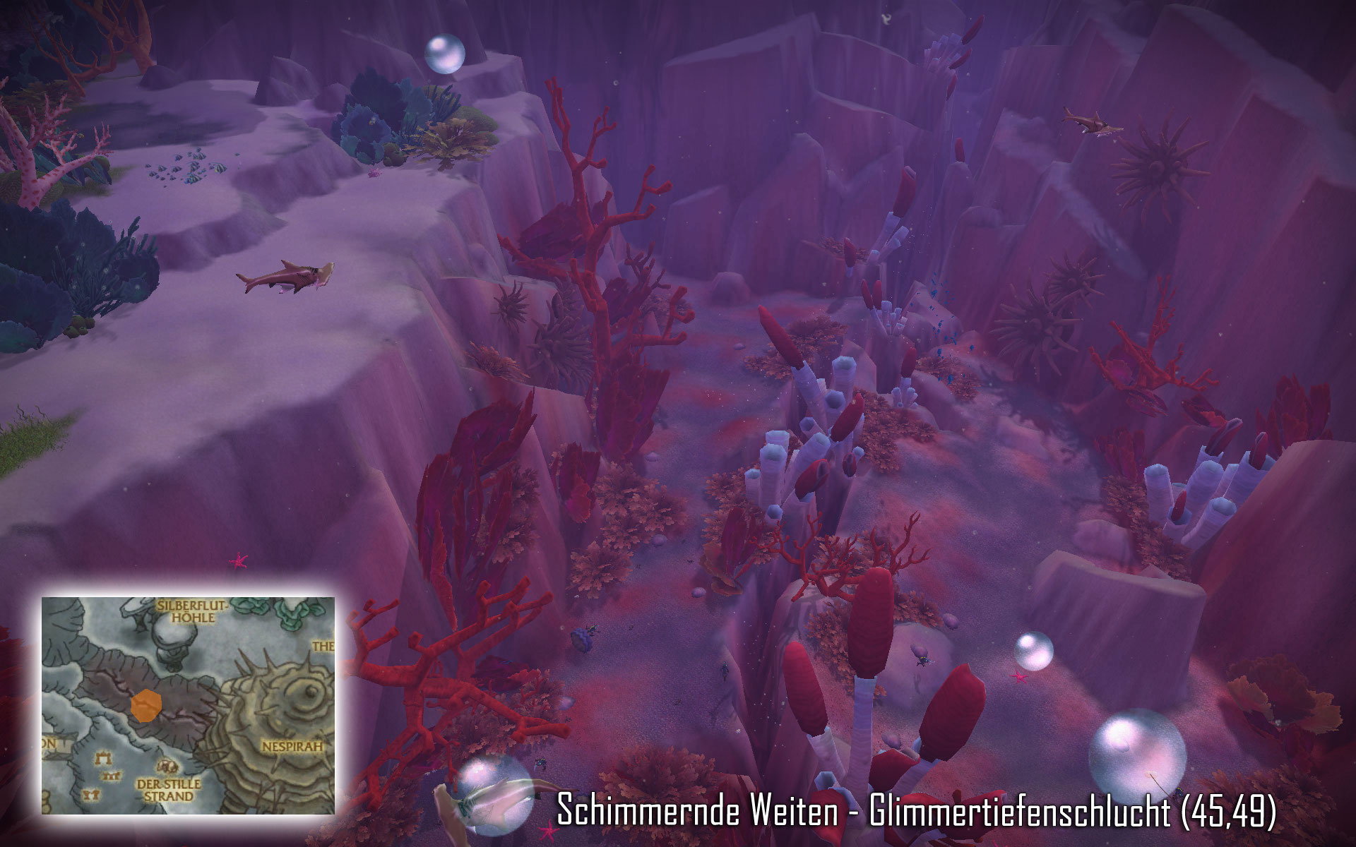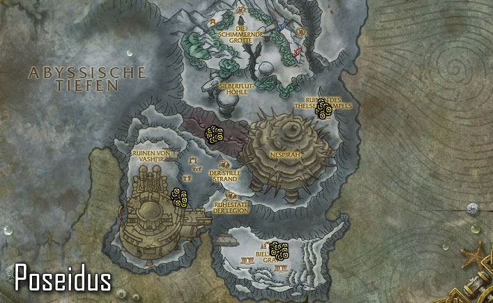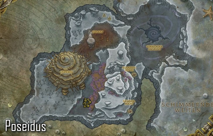 Zügel von Poseidus Mit diesem epischen Seepferdchen (Beruhigtes Seepferdchen) könnt ihr im Gegensatz zum Vashj'ir-Seepferdchen nicht nur in Vashj’ir schwimmen, sondern überall wo sich Wasser befindet. Poseidus ist ein seltenes Stufe 81 Seepferdchen, welches an verschiedenen Punkten in Vashj’ir spawnen kann. Soweit mir bekannt ist, gibt es für Poseidus keine festen Zeiten, ihr benötigt also wie immer etwas Glück. Etwas weiter unten findet ihr aber alle Spawnpunkte (5) wo Poseidus erscheinen könnte. Mit knapp 56.000 Lebenspunkten sollte Poseidus auch für Spieler der Stufe 80 kein wirkliches Problem darstellen. Schimmernde Weiten: ![]() ![]() ![]() ![]() ![]() Abyssischen Tiefen: ![]()